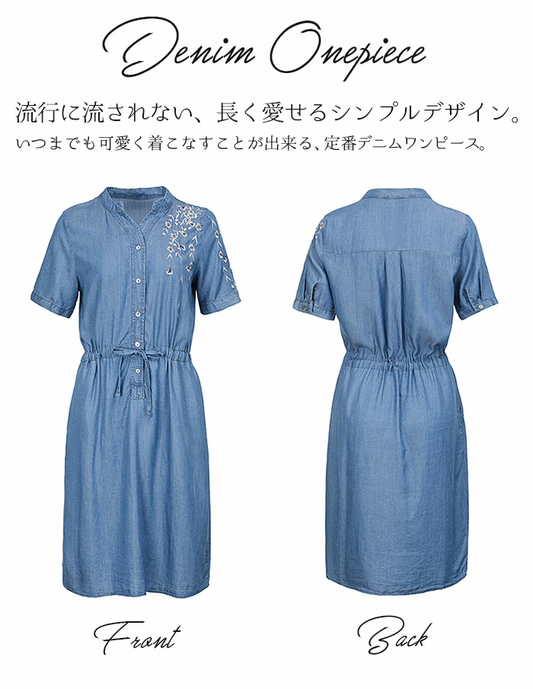 デニム ワンピース 夏 半袖 膝丈 きれいめ オシャレ ブラウス aqh-s23591