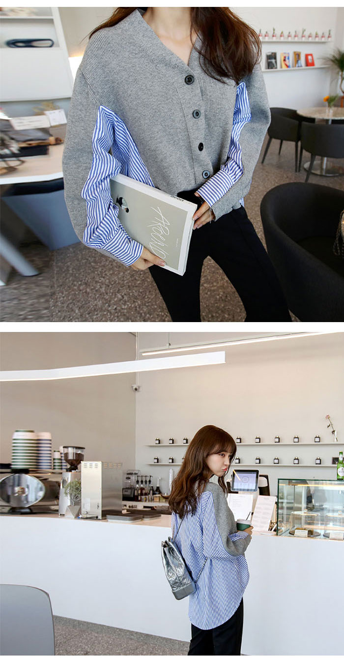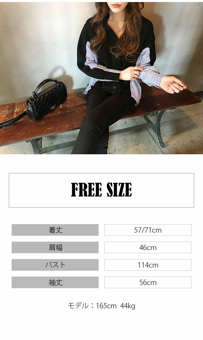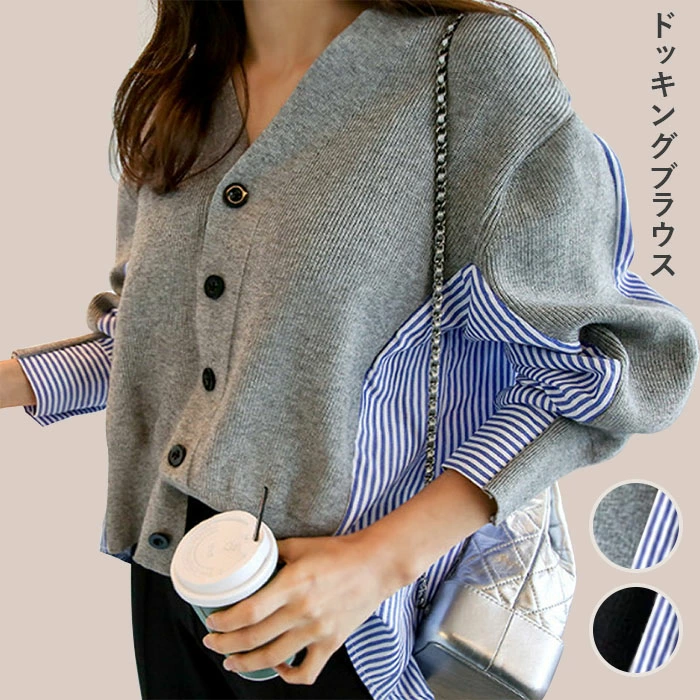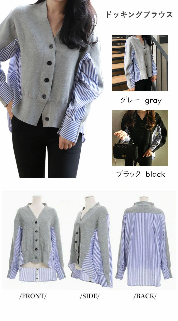 ★シャツとニットをドッキングしたニットカーディガン。前から見ればカーディガン、後ろはシャツという一風変わったデザイン。配色ニットとストライプの組合わせがオシャレな1枚です。