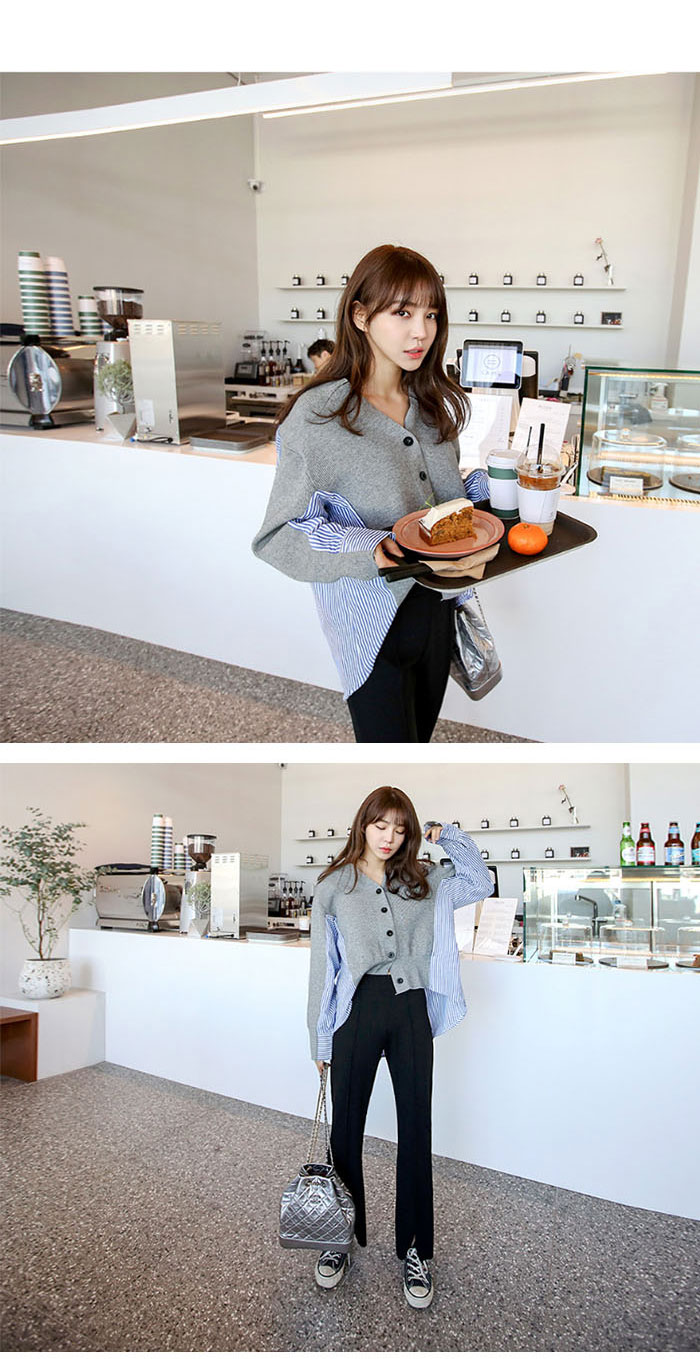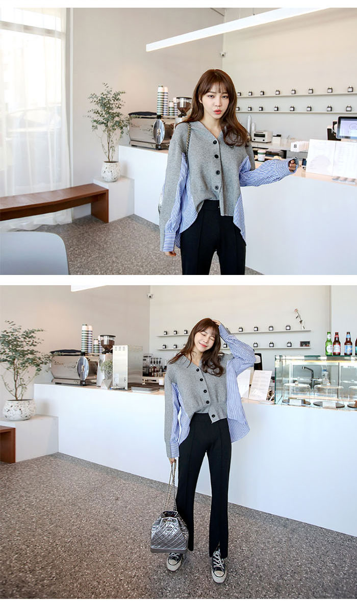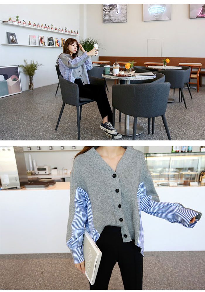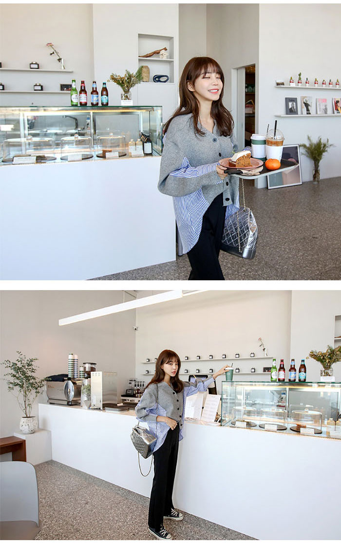 ★シャツとニットをドッキングしたニットカーディガン。前から見ればカーディガン、後ろはシャツという一風変わったデザイン。配色ニットとストライプの組合わせがオシャレな1枚です。