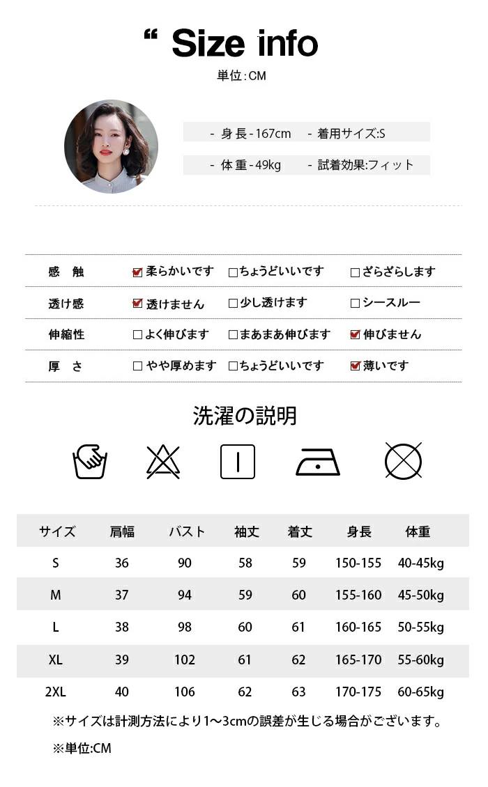 | コメント | ★1無地でシンプルなデザインは大人可愛くて、普段着としてもスーツと合わせてもご愛着いただけます。長袖でこれからの季節はもちろん、ロングシーズンにご利用いただけます。ゆったりとしたデザインでカジュアル場合に活躍できます。通勤のフォーマル場合や普通のお出掛けなどの場合に最適なシャツ・ブラウスです。 ★立ち襟なので小顔効果が期待出来ます。ギャザーが入った首回りと胸元がすっきりとした落ち着いたイメージを演出します。長袖ですが薄手なので夏には一枚でもご着用頂けます。 スキニーやスーツを合わせればオフィスカジュアルにもお使いいただます◎ 合わせるボトムやアクセサリーによって、雰囲気も自由自在♪ 他にも、通勤や通学、テレワークや在宅ワーク、リモートワークや会議、デートや記念日、お呼ばれやパーティー、食事会やイベントなど様々なシーンで大活躍します! 簡単に大人女子コーデが決まるので、リピート率が上がること間違いなし♪ ★柔らかくて吸湿性良いので快適な着心地ができる長袖で、これからの春や初夏にはぴったり。落ち感ある生地でゆったりとしたシルエットで体型カバーしてくれて、大人抜け感も演出。 ★質感よくて立体的なシルエットは体型カバーしてくれて着痩せ効果が期待できます。シンプルでコーデやすくて格好いいイメージになれ、さらりとしたシフォン素材がしっかりしていて、色も綺麗なシャツです。 |