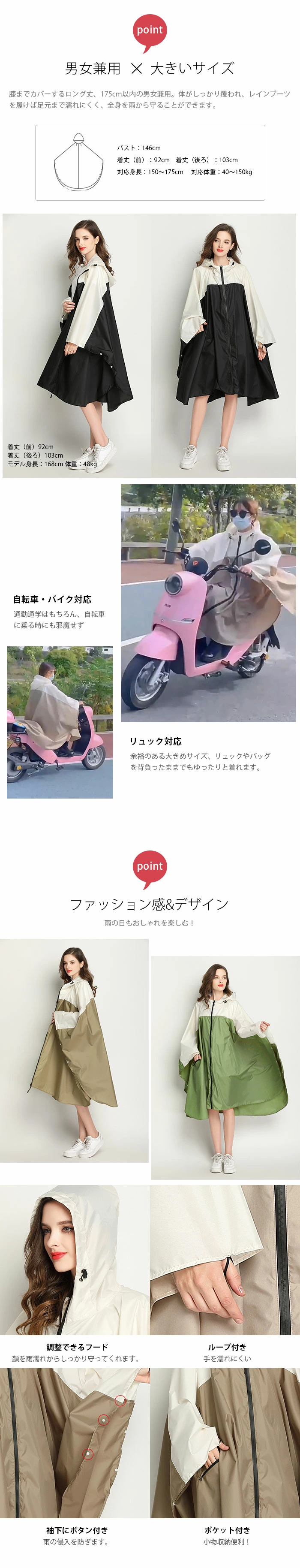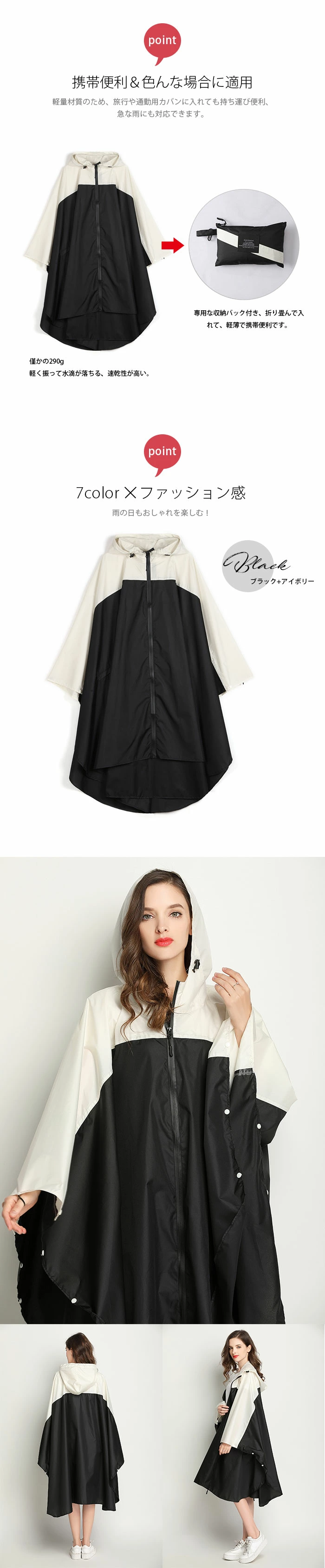 | コメント | ★【サイズ】:前丈92cm,後丈103cm,袖丈61cm,バスト146cm,適応身長:150~175cm男女兼用のサイズです。 ★【防水&通気レインコート】:ポリエステル100%(テフロン加工)で通気性がいい。防水材質を採用していて、環境にいいPU表面処理されました。高防汚れ、防水、耐摩耗性、表面防水、縫い目防水、風保護、雪保護。快適な防水性と高抗汚れなので、大雨でも心配いらないのです。 ★【男女兼用&速乾レンコート】:落ち着けな色で男女とも利用できます、十分な大きさと自由にキツサを調整できるフード絞り紐付き、顔を雨濡れからしっかり守ってくれます。膝までカバーするロング丈、175cm以内の男女兼用。体がしっかり覆われ、レインブーツを履けば足元まで濡れにくく、全身を雨から守ることができます。 ★【携帯便利の収納レインコート】:専用な収納バック付き、折り畳んで入れて、軽薄で携帯便利です。【重さ】僅かの290g;軽く振って水滴が落ちる、速乾性が高い。 ★【様々なレインシーンに対応!】 通勤・通学・自転車・バイクなどの日常使いはもちろん、キャンプや釣り、ハイキングなどのアウトドアまで幅広くご使用いただけます。梅雨シーズンの豪雨・台風対策などでも活躍間違いなしです!雨の日の自転車で、機能もおしゃれも妥協したくない人のための、高い機能性とデザイン性を両立させたレインコートです。 |