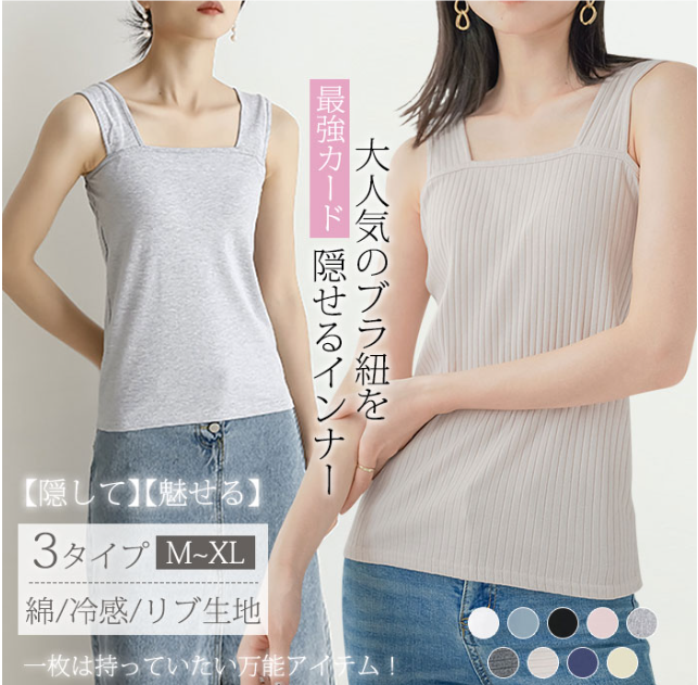 タンクトップ レディース スクエアネック 冷感 リブ インナー ブラ紐隠しインナー